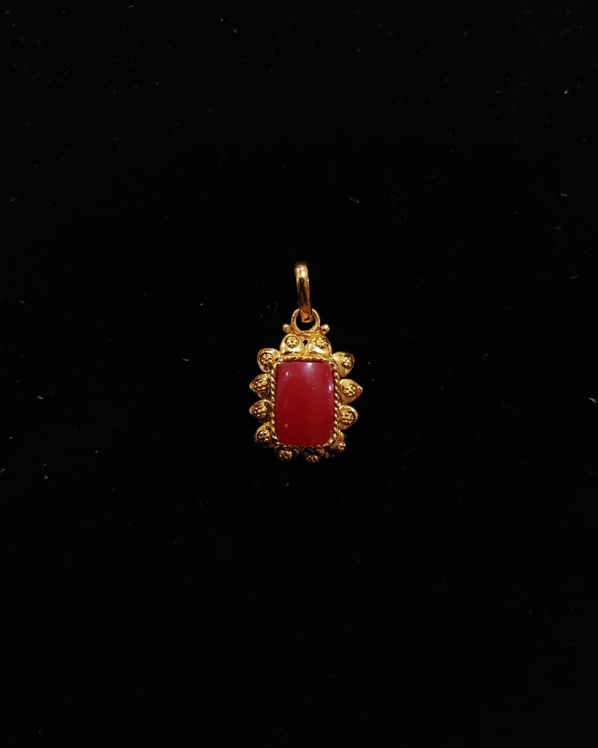Add a pop of color and artisanal charm with this stunning gold-toned pendant. At its center lies a rectangular red coral or muga stone, renowned for its rich, warm hue. The stone is delicately set within an ornate floral-style frame, highlighting the intricate craftsmanship and attention to detail. Lightweight yet striking, this pendant pairs beautifully with both casual and formal attire, making it a versatile addition to any jewelry collection. A perfect accessory to showcase natural beauty and timeless elegance.