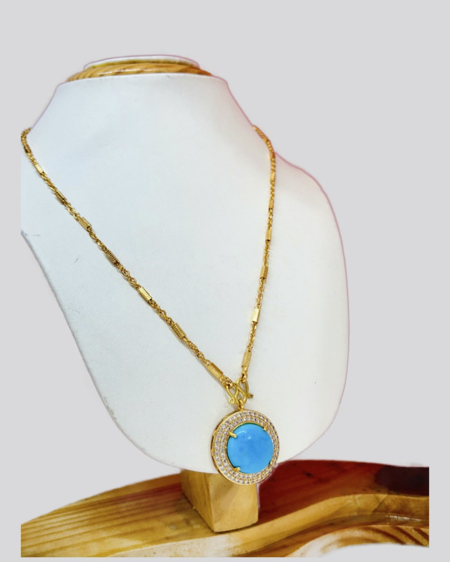 Delicate diamond accents surround or complement the turquoise, adding brilliance and enhancing the pendant’s luxurious appeal. The polished yellow gold chain provides a classic foundation, allowing the gemstones to take center stage.